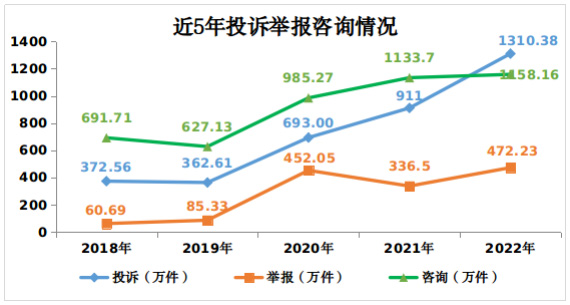2022年,全國市場監管部門通過全國12315平臺、電話、傳真、窗口等渠道共受理消費者投訴、舉報和咨詢2940.77萬件,同比增長23.5%。其中,投訴1310.38萬件,舉報472.23萬件,為消費者挽回經濟損失45.19億元,有力保護了消費者合法權益。主要呈現十大特點: