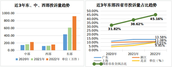 從近三年趨勢看,因平臺經濟的跨區域擴張、人口資本的跨區域流動、市場要素的跨區域配置,廣東、浙江、上海、北京4個省市的消費正在加速集聚。消費投訴數量與消費活躍水平呈正相關關系,四省市消費投訴數量在全國的占比從2020年的31.8%增長到2022年的45.16%。消費投訴的加速集聚在一定程度上反映了消費供給側發展的不平衡,需要進一步恢復和擴大中西部地區消費,推動更高質量、更加平衡的發展。