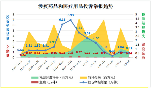 “二十條”和“新十條”出臺后,疫情防疫重心從防控感染轉到醫療救治,涉疫藥品和醫療用品需求激增、供應不暢,價格異常波動、產品質量問題頻現,相關投訴舉報咨詢量一度呈井噴式增長。2022年11月10日至2022年底,全國12315平臺接收相關投訴舉報24.11萬件,同比增長3.88倍,環比增長2.95倍,最高峰值達到19.5倍。其中,投訴14.18萬件,舉報9.93萬件,挽回經濟損失498.17萬元。