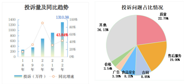 2022年,全國市場監管部門受理消費者投訴1310.38萬件,同比增長43.84%,增速較2021年有所放大。從投訴問題看,質量298.70萬件、售后服務248.96萬件、合同115.91萬件、食品安全109.06萬件,合計占投訴的58.96%。其中,售后服務問題增長最快,群眾反映最強烈,同比增長57.67%。