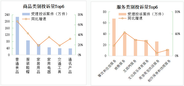 2022年,全國市場監管部門共受理商品投訴862.32萬件,占投訴的65.81%,較上年提高4.37個百分點;服務投訴448.06萬件,占投訴的34.19%。商品類投訴占比提升,反映了實體經濟下行壓力下產品質量問題凸顯,其中投訴量靠前的是:普通食品、服裝鞋帽、家居用品、家用電器、交通工具、通訊產品,占比58.43%。服務投訴量靠前的是:餐飲住宿、銷售、互聯網服務、文化娛樂體育、美容美發洗浴,占比46.37%。