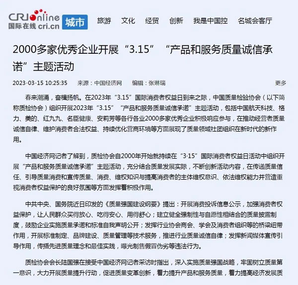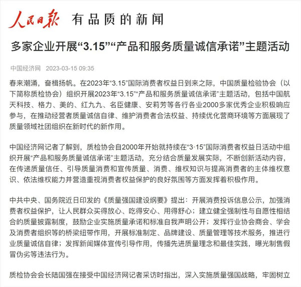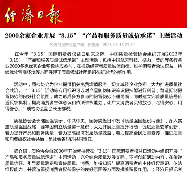 ——中國質量檢驗協會組織2000多家優秀典范企業開展“3.15”產品和服務質量誠信承諾活動