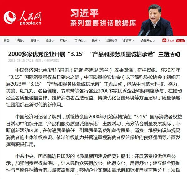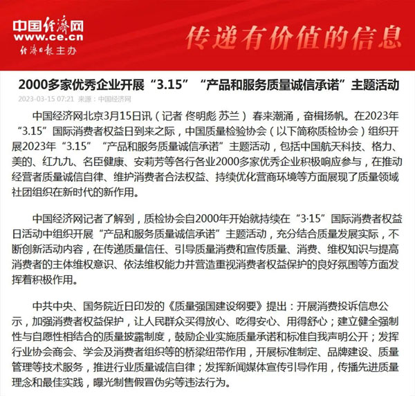 中國經濟網北京3月16日訊 (記者 佟明彪 蘇蘭) 東風浩蕩滿眼春,萬里征途惟奮進。全國兩會閉幕,高質量發展嶄新啟航。在“3.15”國際消費者權益日到來之際,中國質量檢驗協會(以下簡稱質檢協會)組織開展2023年“3.15”產品和服務質量誠信承諾主題活動,吸引了包括中國航天科技、格力、美的、紅九九、名臣健康、安莉芳等各行各業2000多家優秀典范企業積極參與,在推動經營者質量誠信自律,維護消費者合法權益,持續優化營商環境等方面展現了質量領域社團組織在新時代的責任擔當。