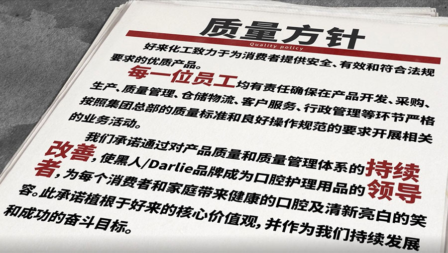 好來化工通過對(duì)產(chǎn)品質(zhì)量和質(zhì)量管理體系的持續(xù)改善,使“DARLIE”黑人品牌成為口腔護(hù)理用品的領(lǐng)導(dǎo)者,為每個(gè)消費(fèi)者和家庭帶來健康的口腔及清新亮白的笑容。此承諾植根于好來的核心價(jià)值觀,并作為好來持續(xù)發(fā)展和成功的奮斗目標(biāo)。