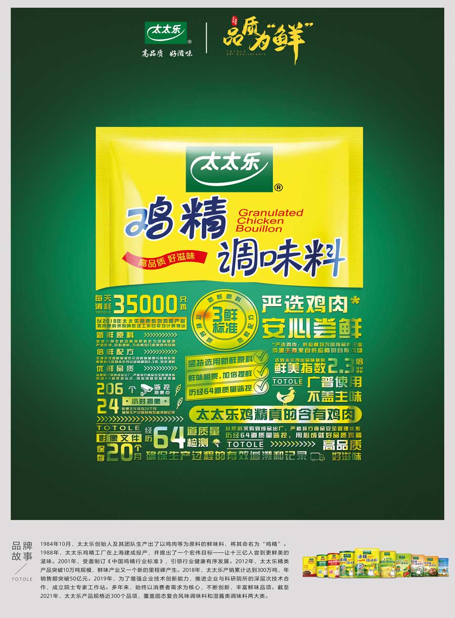 上海太太樂食品有限公司創立于1988年,中國雞精、雞粉行業標準制定單位之一,并于1999年加入世界知名的食品飲料公司瑞士雀巢,充分利用國際資源加速產品和技術研發。秉承“太太樂,讓生活更美好”的企業愿景,太太樂一直致力于鮮味科學的研究和推廣,帶動鮮味產業的技術創新,不斷為消費者帶來健康又美味的新一代調味品。