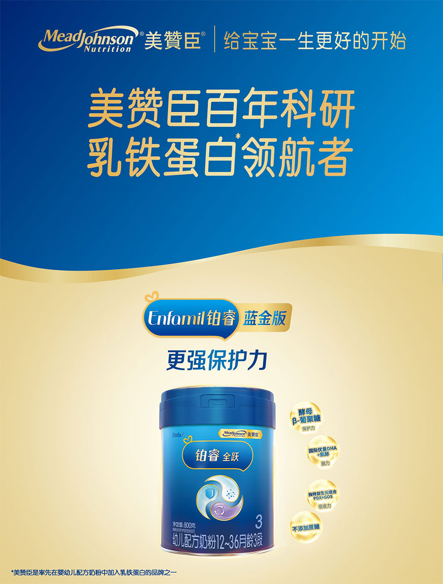 美贊臣創立于1905年,自創立起始終堅持以科學為本進行產品研發和創新,為全球嬰幼兒提供科學營養,致力于“給寶寶一生最好的開始”。1993年,美贊臣正式進入中國,在廣州設立生產基地。植根中國近三十載,陸續推出藍臻、鉑睿、安兒寶、全躍、親舒、早產兒出院后配方、無乳糖配方等消費者熟悉的嬰幼兒配方產品,每天守護寶寶健康成長,受到廣大中國消費者的歡迎和喜愛。