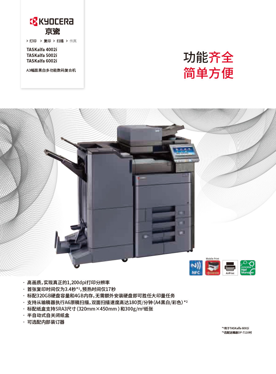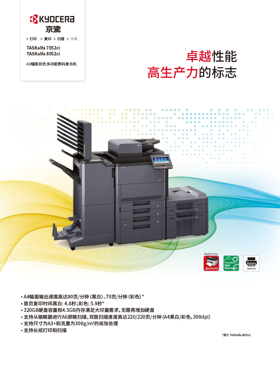 主要產(chǎn)品:KYOCERA京瓷激光打印機(jī),一體機(jī),復(fù)合機(jī),生產(chǎn)型彩色噴墨數(shù)碼印刷系統(tǒng)及辦公信息系統(tǒng)的開(kāi)發(fā)、設(shè)計(jì)、系統(tǒng)集成