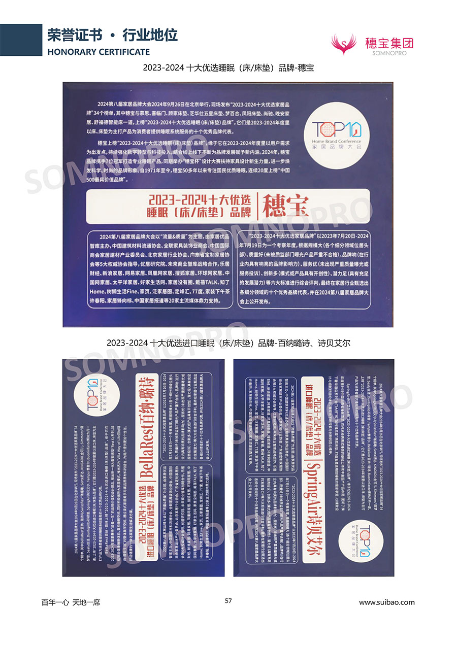 自1971年獨立研發生產出專屬國人的彈簧床墊,穗寶關于優質深度睡眠的研究已有半個世紀的歷史。穗寶始終以“懂科學的時尚國民品牌”為定位,堅守“百年一心 天地一席”的價值追求,專注中國消費者的睡眠研究,針對中國人特點進行優化創新,不斷提升國人的睡眠體驗,只為成就每個晚上8小時的優質深度睡眠。憑借不斷革新的研發科技和深受消費者信賴的產品品質,穗寶集團旗下品牌和產品屢獲國內外大獎,連續21年榮膺中國500最具價值品牌,品牌價值高達339.23億元。