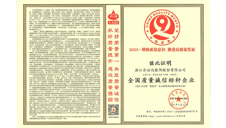 喬治白先后榮獲中國名牌產(chǎn)品、中國職業(yè)裝十大領(lǐng)軍企業(yè)、全國守合同重信用單位、國家級綠色工廠、浙江省智能工廠等榮譽(yù)稱號。作為全國標(biāo)準(zhǔn)化工作先進(jìn)單位,喬治白積極參與標(biāo)準(zhǔn)化工作,先后參與《職業(yè)裝檢驗(yàn)規(guī)則》、《襯衫》、《女西服、大衣》等9項(xiàng)國家標(biāo)準(zhǔn)的起草與修訂工作,《全毛襯西服》行業(yè)標(biāo)準(zhǔn)起草。