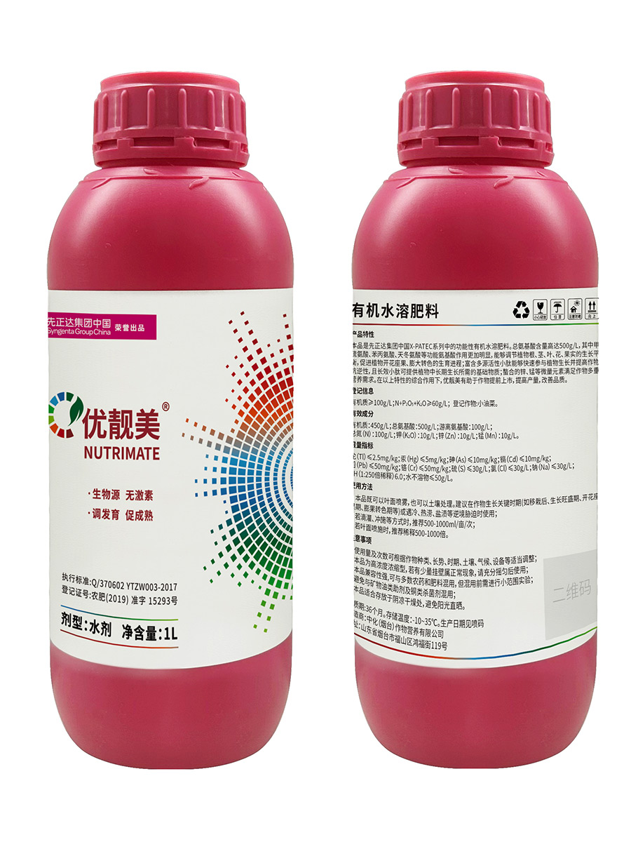 優靚美是先正達集團中國X-PATec系列中的功能性有機水溶肥料。總氨基酸含量高達500g/L,能夠調節植物根、莖、葉、花、果實的生長平衡,促進植物開花座果、膨大轉色的生育進程;提高作物抗逆性,滿足作物多重營養需求。有助于作物提前上市,提高產量,改善品質。