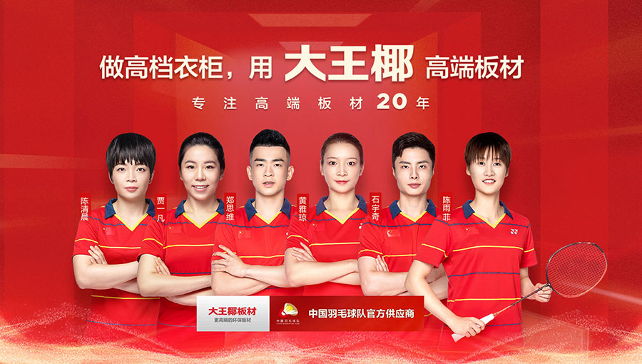 大王椰掌握5項關鍵除醛技術,100余項國家技術專利,始終保持技術引領。大王椰不斷創新產品,陸續發布楠香木生態板、A7家具板、植萃除醛板、抗菌除醛板、A8高定板、1號原木板、雙效抗菌板、ENF級生態板、實木TT門板、PET柜門板等高端產品。2021年7月,大王椰正式簽約中國羽毛球隊,致力于打造冠軍品質,大王椰讓更多健康產品走進更多家庭。2024年4月,大王椰正式成為航天CNSPACE官方合作品牌,以航天精神為榜樣,不斷提升家居健康品質。