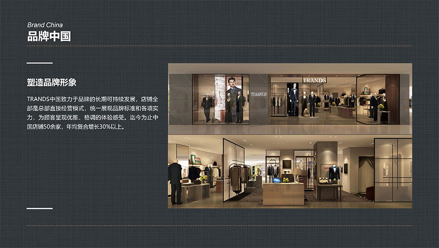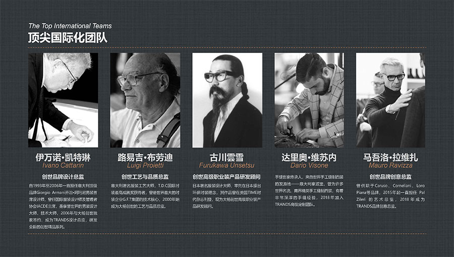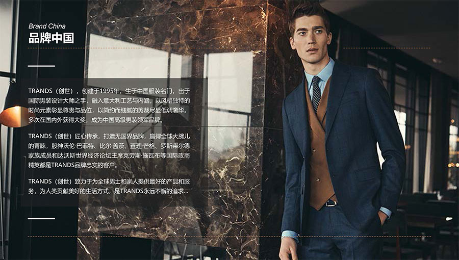 創世品牌(TRANDS):創建于1995年,是當今中國高級男裝的代表品牌之一。TRANDS創世成衣產品及量身定制的西裝以其至臻品質和精湛工藝,贏得眾多國際政商精英多年來的青睞。