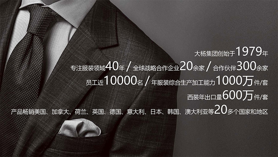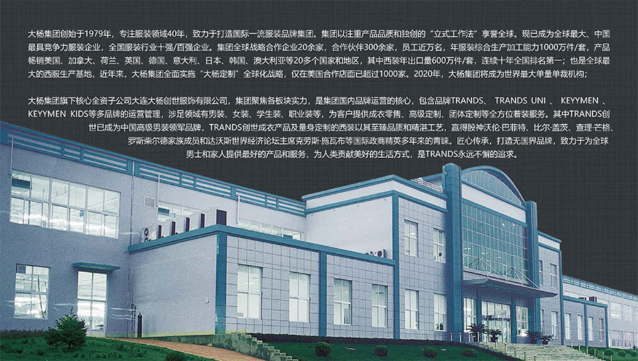大楊集團創建于1979年,總部位于遼寧省大連市,主要生產和銷售各類中高檔服裝產品為主的國際化大型服裝企業,以西裝縫制享譽全球,是世界重要的西裝生產加工基地。現有直屬(控股)成員企業20家,員工4500人。控股子公司大連大楊創世股份有限公司2000年在上海證券交易所上市,并于2016年完成重大資產重組。