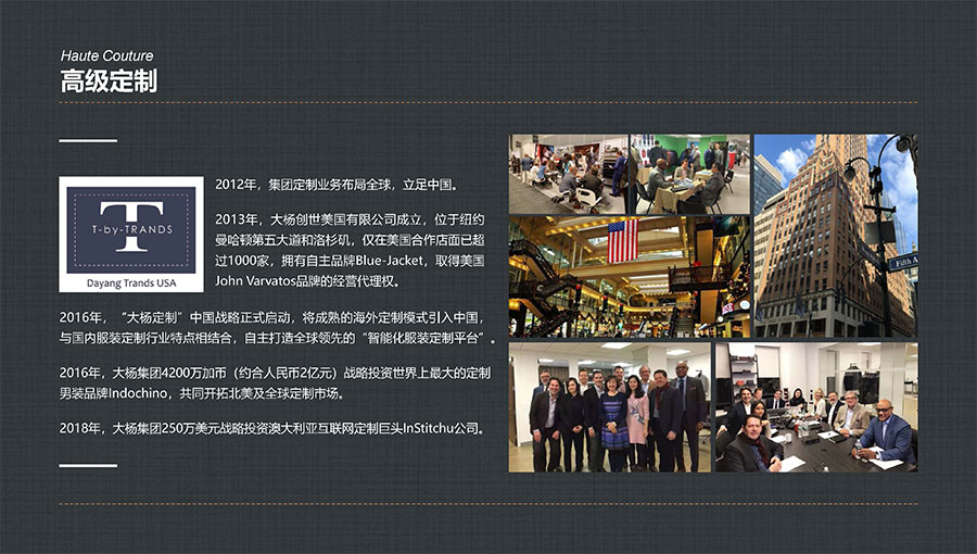 目前,大楊集團全球營銷網絡已遍布美國、加拿大、荷蘭、英國、澳大利亞及日本等27個國家和地區,開設單裁合作店面上千家,與加拿大互聯網定制巨頭Indochino公司、澳大利亞知名男裝定制企業Institchu公司、美國服裝巨頭TBI公司簽署戰略合作協議,年定制產品數量已突破200萬件/套,具備西裝、襯衫、休閑裝以及大衣、風衣等全品類定制生產能力。