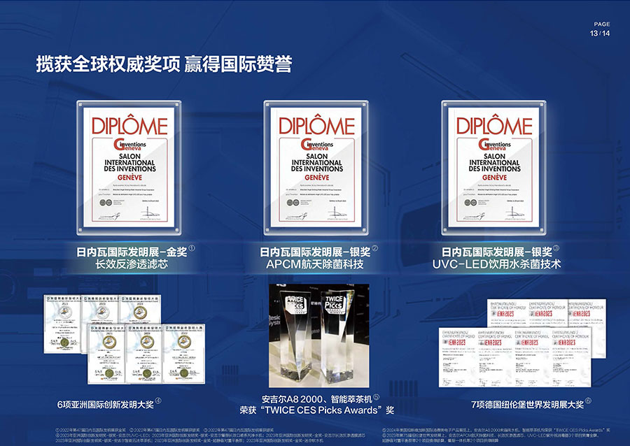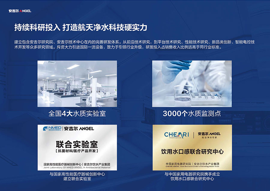37年來,安吉爾始終堅持科技創新,不斷引領行業技術升級。參與17項國家及行業標準制修訂,累計獲得900余項專利,建立4大水質實驗室。2023年,安吉爾憑實力斬獲全球9項發明獎,包含3項日內瓦國際發明展獎項,6項亞洲創新發明展獎項。