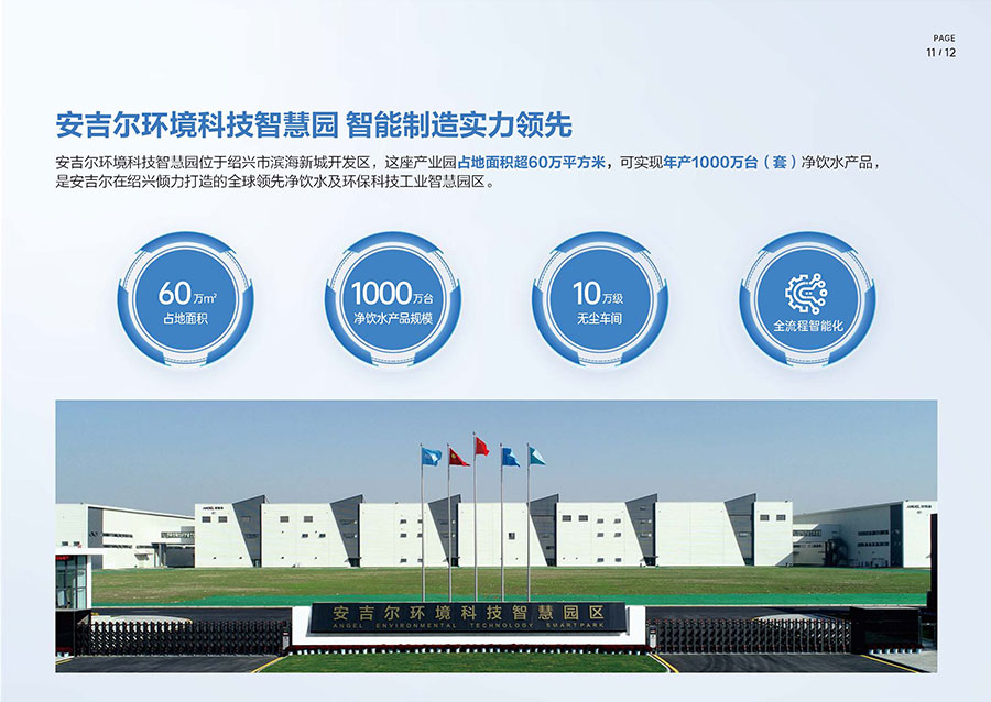 安吉爾擁有三大生產基地,其中安吉爾環境科技智慧園占地超60萬平方米,可實現年產1000萬臺(套)的凈飲水產品規模。安吉爾擁有完整的生產管理體系,已獲中國CQC、美國UL、美國NSF、加拿大CSA、法國BV、英國ITS、瑞士SGS和德國TüV全球八項權威機構認證。