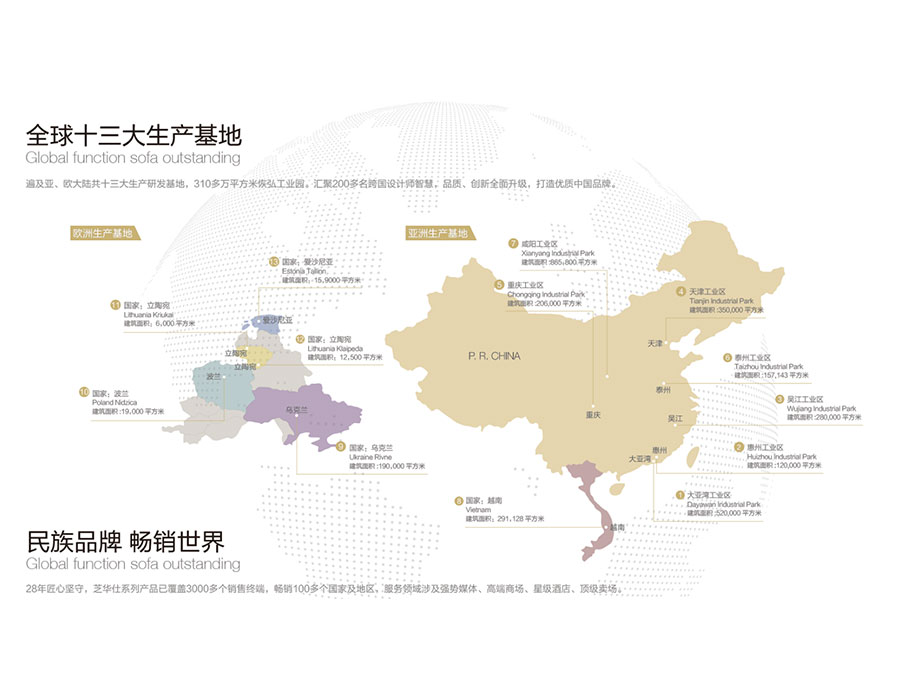 在全球設有多家子公司、分公司及關聯公司,運營網絡橫跨亞、美、歐、澳四大洲,擁有超過8000個銷售終端,產品暢銷中國、美國、英國、加拿大等100多個國家及地區,旗下“CHEERS”、“芝華仕”和“頭等艙”品牌專賣店超過8000家,形成了體系完備的全球跨國發展大格局,已成為集研發、制造、銷售和服務于一體的國際化智能家居企業。