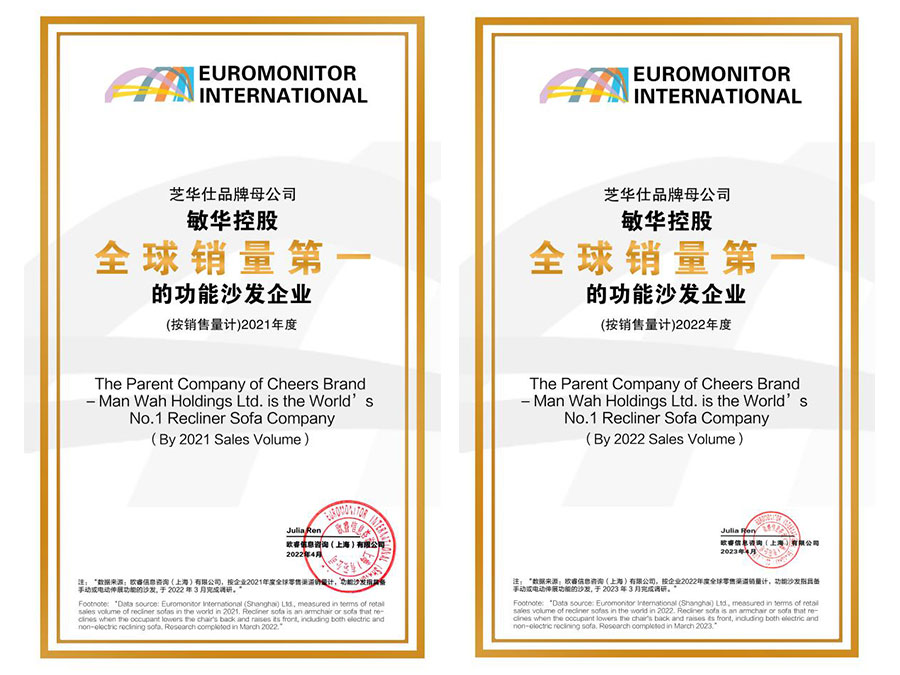 沙利文(Frost&Sullivan)數據顯示,在中國功能沙發市場上,芝華仕品牌在中國功能沙發零售市場占有率從2018年的45.3%上升至2019年的50.1%,位列前茅;2010年至2023年已經連續13年在中國功能沙發零售市場占有率前茅;2021年(據歐睿國際數據)、2022年(據沙利文數據)芝華仕母公司敏華控股榮獲“全球銷量第一的功能沙發企業”。