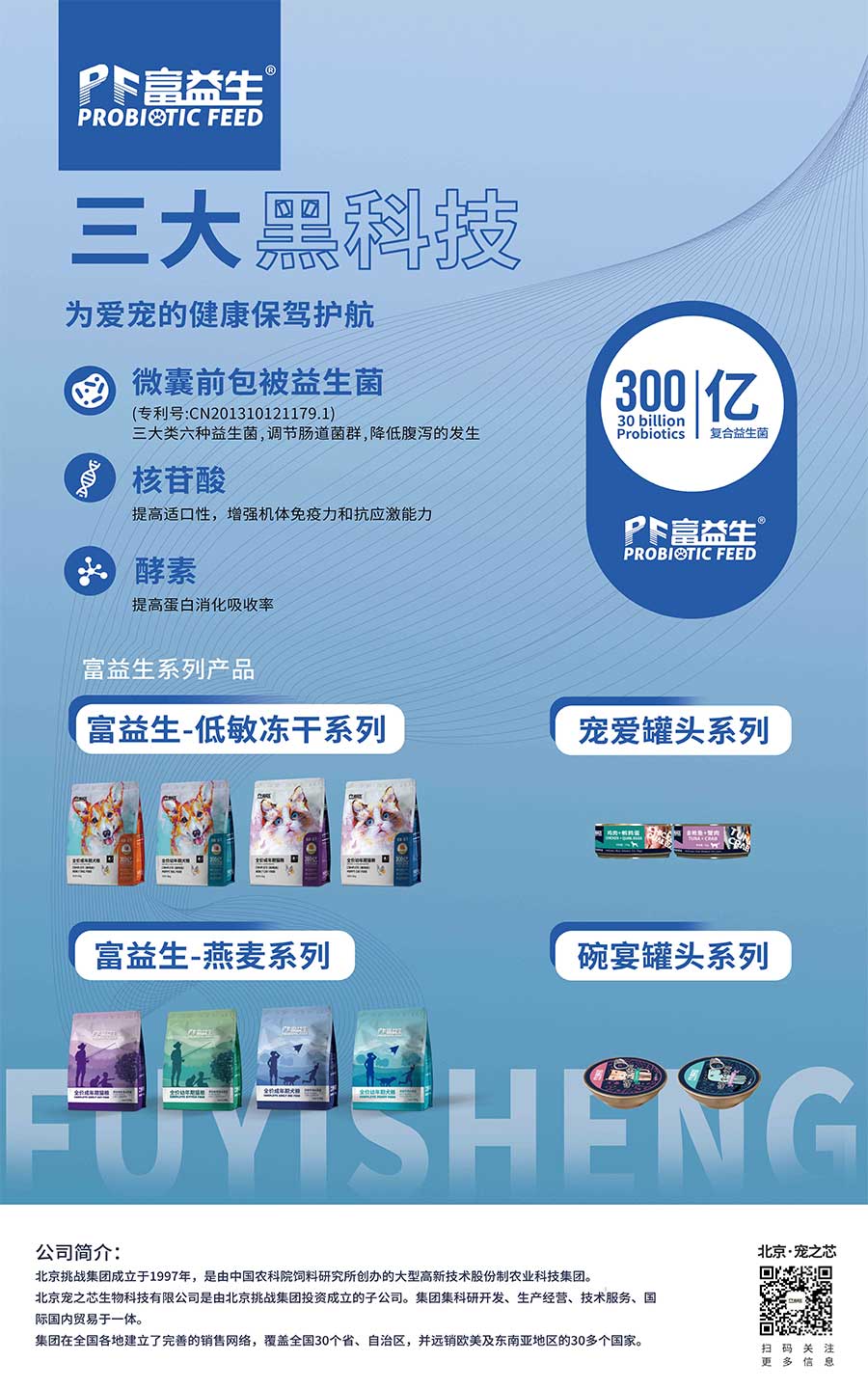 北京挑戰集團將科技創新視為企業生命的源泉,組建挑戰研究院,其中博士生導師3人,博士14人,碩士40余人,擁有國家級“生物飼料開發國家工程研究中心”“院士專家工作站”和“企業博士后流動站”各一個。至今獲取專利授權31件,主持承擔國家和行業研發項目共23項。挑戰集團研究院院長張廣民博士帶領寵物食品研發團隊經過多年的研究與試驗成功將全價寵物干糧與多種益生菌及酶制劑完美的結合-富益生全價寵物食品。通過添加挑戰集團自主產品“微囊前包被益生菌”“核苷酸”及酶制劑使富益生產品獲得了強大的產品優勢。