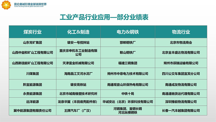 經(jīng)過多年的發(fā)展,昆侖奧誠的品牌影響力不斷擴(kuò)大,銷量顯著增長,實(shí)力不斷增強(qiáng)。昆侖奧誠在全國各地建立了多層銷售網(wǎng)絡(luò),用戶遍布汽車制造、工程機(jī)械制造、鋼鐵、礦山綜合采礦設(shè)備、熱發(fā)電、工程機(jī)械、船舶、紡織機(jī)械設(shè)備等工業(yè)產(chǎn)品,覆蓋工程機(jī)械油、汽車油、工業(yè)油、油脂、特種油等多個(gè)石化領(lǐng)域。