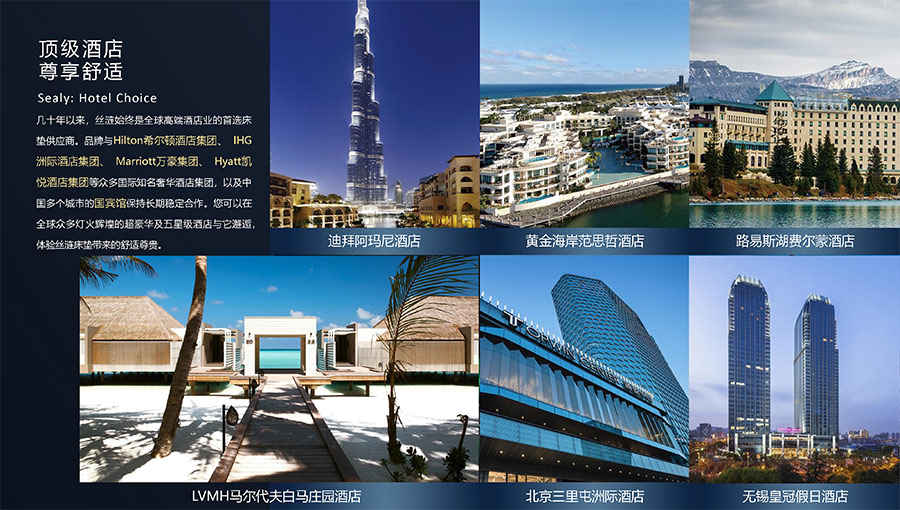 幾十年以來,絲漣始終是全球高端酒店業的首選床墊供應商。品牌與Hilton希爾頓酒店集團、IHG洲際酒店集團、Marriott萬豪集團、Hyatt凱悅酒店集團等眾多國際知名奢華酒店集團,以及中國多個城市的國賓館保持長期穩定合作。您可以在全球眾多燈火輝煌的超豪華及五星級酒店與它邂逅,體驗絲漣床墊帶來的舒適尊貴。