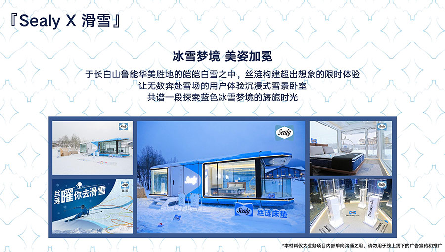 于長白山魯能華美勝地的皚皚白雪之中,絲漣構建超出想象的限時體驗,讓無數奔赴雪場的用戶體驗沉浸式雪景臥室,共譜一段探索藍色冰雪夢境的旖旎時光。
