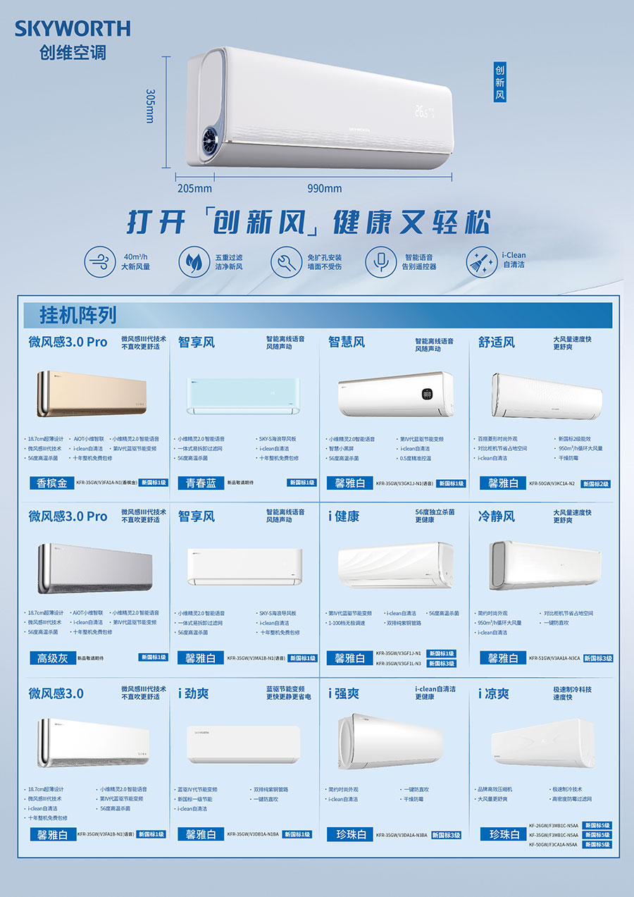 主要產品:SKYWORTH(創維)家用空調、商用空調、車用空調、廚房空調、移動空調、凈化器等產品