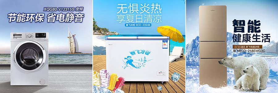 主要產品:新飛牌冰箱、冰柜、空調、洗衣機、酒柜