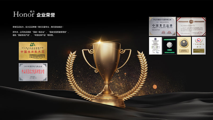 1989年,威力首批被命名為“國家一級企業”;1995年,榮獲“中國洗衣機大王”的稱號,是中國唯一被國家正式授予該稱號的品牌;2001年,威力首批榮獲“國家免檢產品”、“中國名牌產品”稱號。近幾年來,威力還先后榮獲“廣東省著名商標”、“廣東省高新技術企業”、“廣東省企業技術中心”、“中山市百佳雇主”、“廣東家電最具全國競爭力十大品牌”、“中山市工程技術中心”等榮譽。