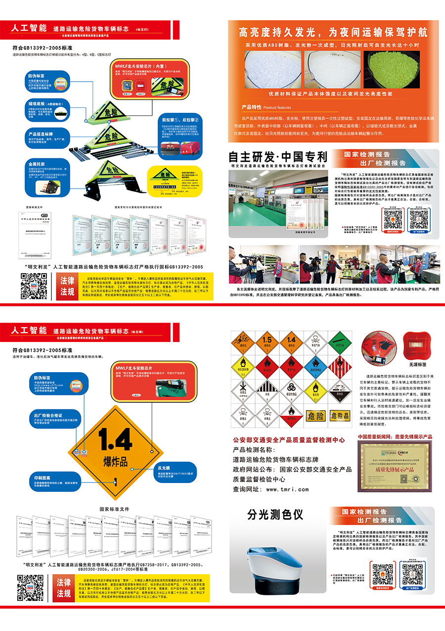 主要產品:北斗安防人工智管系統,火災爆炸危險場所移動稽查車,危險品運輸安全隱患移動檢測車,危險品運輸車輛安防裝備租售檢測亭,不產生火花人工智能汽車導靜電橡膠拖地帶,人工智能機動車排氣火花熄滅器,人工智能道路運輸危險貨物車輛標志燈、標志牌