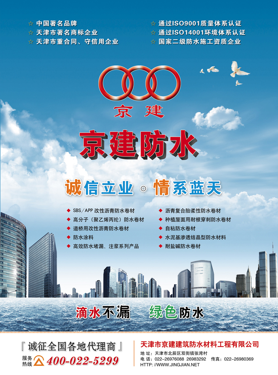 主要產品:京建牌防水卷材、防水涂料