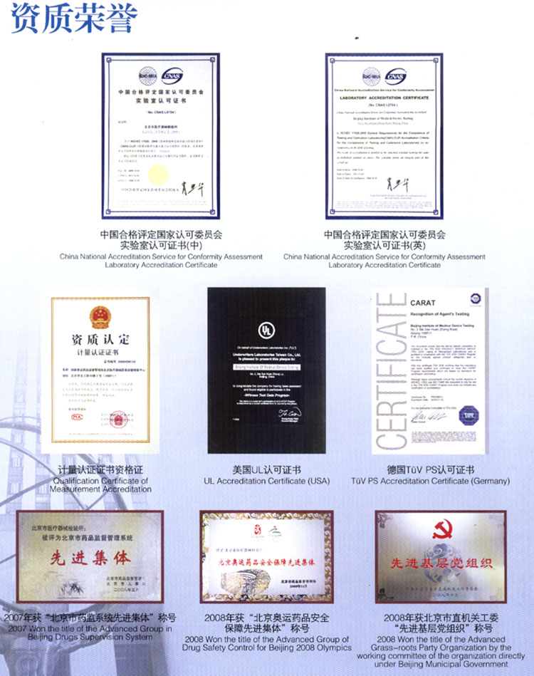 北京市醫療器械檢驗所(國家食品藥品監督管理局北京醫療器械質量監督檢驗中心,以下簡稱“北檢所”)是中國合格評定國家認可委員會(CNAS)、中國國家認證認可監督管理委員會(CNCA)、國家食品藥品監督管理局(SFDA)等部門認可授權的一所綜合性醫療器械產品檢測機構。經CNAS授權的檢驗范圍涵蓋醫用電子、醫用射線、核醫學、電聲學、體外診斷系統、一次性醫療產品、醫用防護用品、醫用橡膠制品、口腔材料、生物安全柜、電磁兼容、生物相容性等專業領域,檢驗項目涉及472項;經SFDA授權檢測項目達599項,承擔著授權范圍內醫療器械產品監督抽驗檢驗、注冊檢驗、認證檢驗、進出口商品檢驗、科技成果鑒定檢驗以及委托檢驗、仲裁檢驗等檢測任務;2002年,成為中國質量認證中心(CQC)簽約實驗室,承擔醫用X射線診斷設備、心電圖機、血液透析裝置和橡膠避孕套的強制性產品安全認證檢測任務。此外,該所先后獲得TüV PS、UL等國際權威認證機構的認可,是目前國內開展檢驗業務專業最全面的醫療器械檢驗機構。