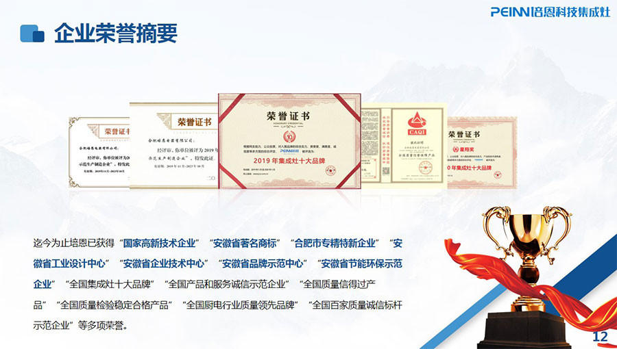 迄今為止,培恩已獲得“國家高新技術企業”、“安徽省著名商標”、合肥市“專精特新”企業、“安徽省工業設計中心”、“安徽省企業技術中心”、“安徽省品牌示范中心”、“安徽省節能環保示范企業”、“全國集成灶十大品牌”、“全國產品和服務誠信示范企業”、“全國質量信得過產品”、“全國質量檢驗穩定合格產品”、“全國廚電行業質量領先品牌”、“全國百家質量誠信標桿示范企業”等多項榮譽。
