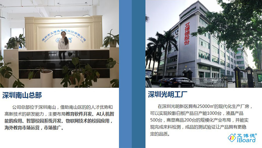 艾博德在深圳光明新區擁有25000平方米的現代化生產廠房,可以實現投影白板產品日產能1000臺,液晶產品500臺,商顯商品200臺的規模化產業布局,并能實現完成來料檢測,成品的測試驗證,讓產品擁有更穩定的品質。
