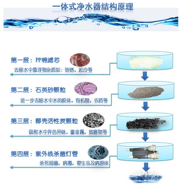鄧凈公司主打產品,鄧凈牌凈水機YCZ-QT8-DJ01。鄧凈凈水機YCZ-QT8-DJ01以生物慢濾為原型,采用純物理凈化原理和漸進式結構即纖維素濾芯+石英石+活性炭+紫外線消毒四級過濾,通過截留、沉降、吸附和殺菌等作用,有效地凈化水源,改善飲用水安全。