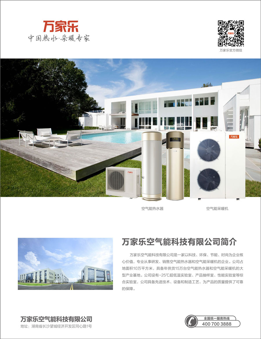 萬家樂空氣能科技有限公司是一家以科技、環保、節能、時尚為企業核心價值,專業從事研發、銷售空氣源熱泵采暖/熱水機的民族企業。公司占地面積10萬平方米,具備年供貨15萬臺空氣源熱泵采暖/熱水機及采暖末端設備的大型熱能產業基地。公司設有熱泵產品抽樣室、熱泵熱水機性能試驗室等綜合實驗室,引進美國、日本等國的先進技術、設備和制造工藝,為產品的質量提供了可靠的保障。