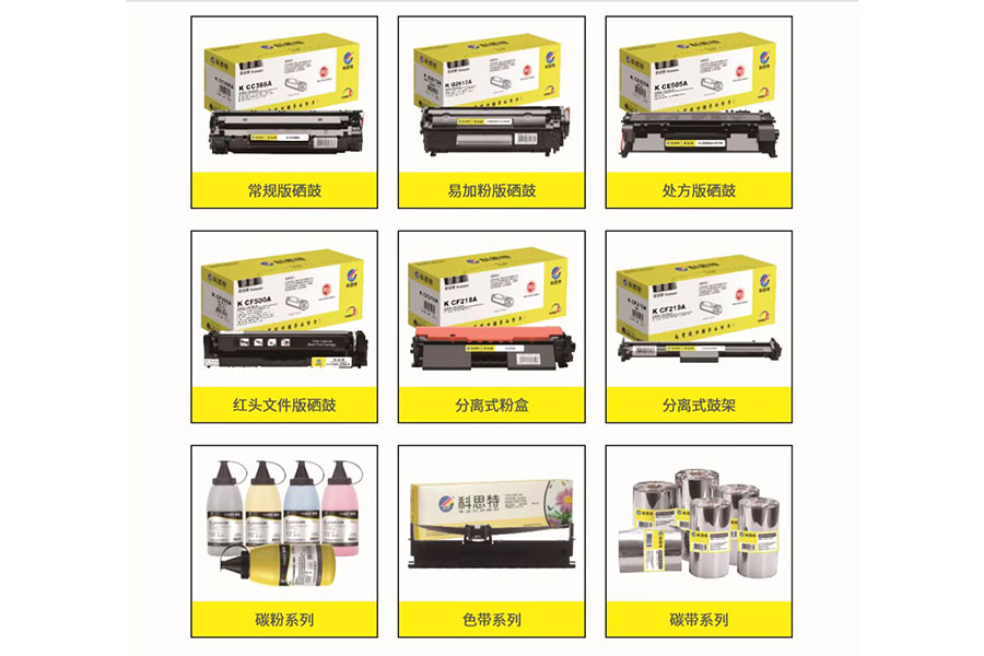 主要產品:科思特、勁彩、諾美佳、帝威、印友品牌硒鼓、墨盒、色帶、墨水、碳粉、粉盒、碳帶、配件等