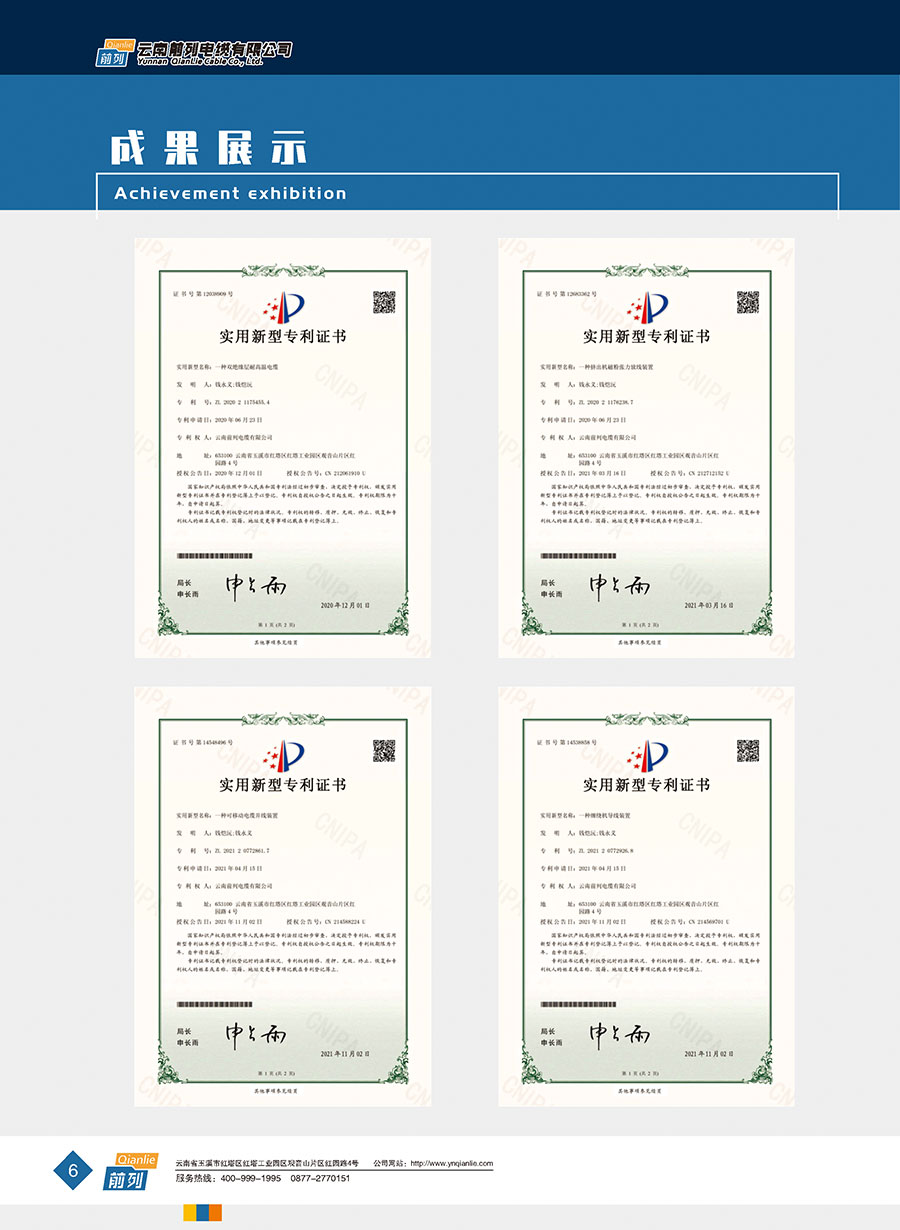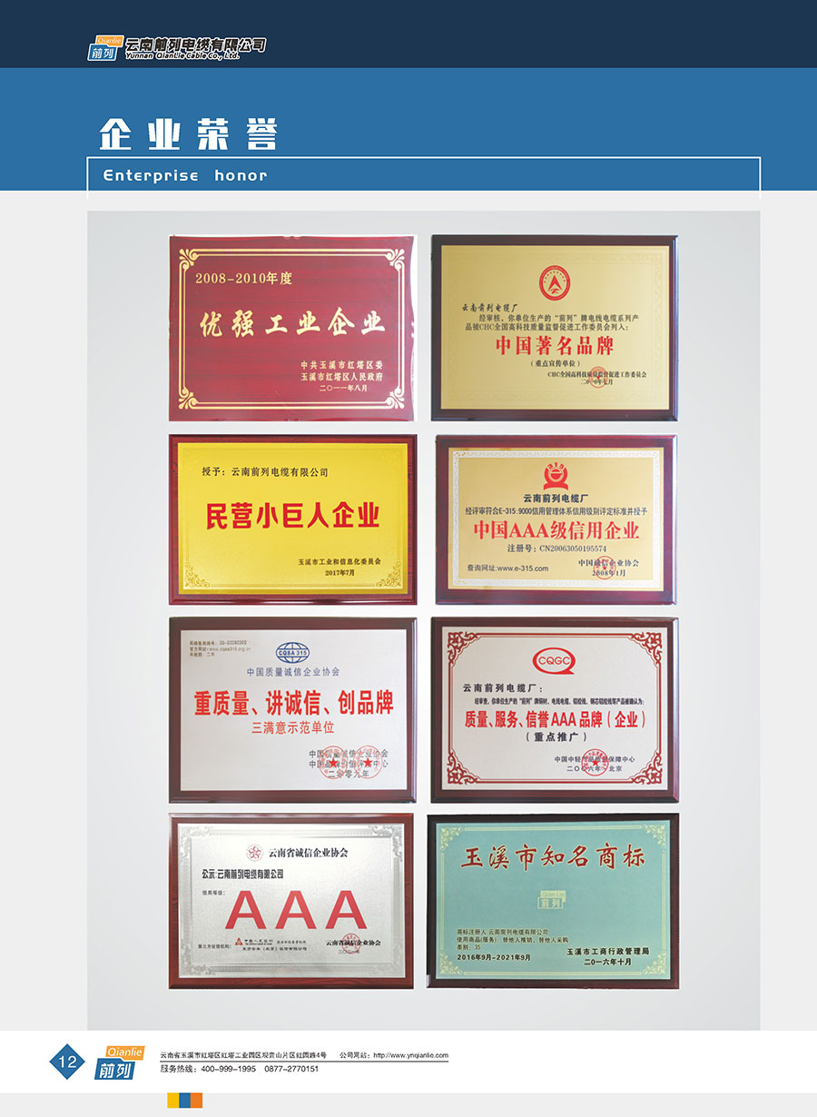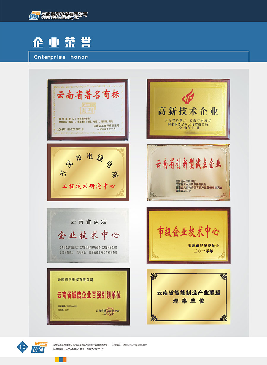 企業管理先進,設施完善,全部產品取得全國工業產品生產許可證證書,電線取得了中國強制性產品CCC認證,同時取得了中國質量認證中心CQC產品自愿認證、RoSH產品認證。前列電纜通過了質量管理體系認證、環境管理體系認證、職業健康安全管理體系認證、能源管理體系認證、兩化融合管理體系認證、五星級售后服務管理體系認證,產品抽檢合格率達100%。公司于2007年成立了企業技術中心,并于2010年被認定為市級企業技術中心,同年被認定為高新技術企業,2014年被認定為云南省創新型試點企業,2015年被認定為玉溪市電線電纜工程技術研究中心,2020年被認定為云南省企業技術中心,2020年前列電纜“基于工業互聯網的電線電纜智能制造新模式應用項目”被列為云南省工業互聯網試點示范項目,2021年被認定為云南省專精特新小巨人企業,2021年云南省工業互聯網“三化”改造試點示范項目,2022年被認定為云南省綠色工廠、云南省工業產品質量標桿企業、云南省知識產權優勢企業。“前列”牌電線電纜是云南名牌、云南省著名商標、玉溪市民營企業公益之星,多次獲得新產品、新技術金獎、消費者信得過產品、質量服務3A企業等榮譽稱號。公司在2022年中國創新方法大賽全國總決賽當中取得云南賽區一等獎,全國一等獎。