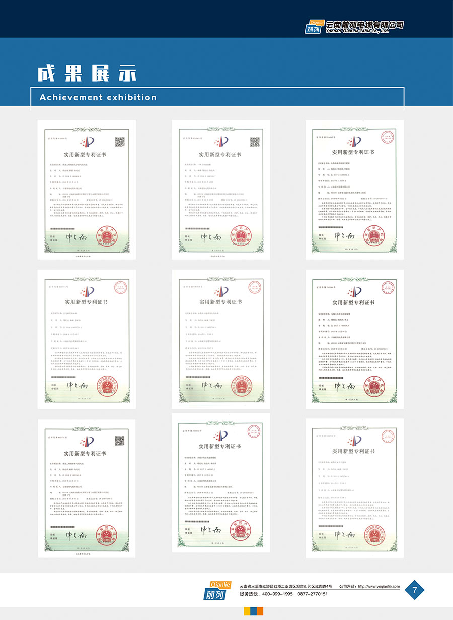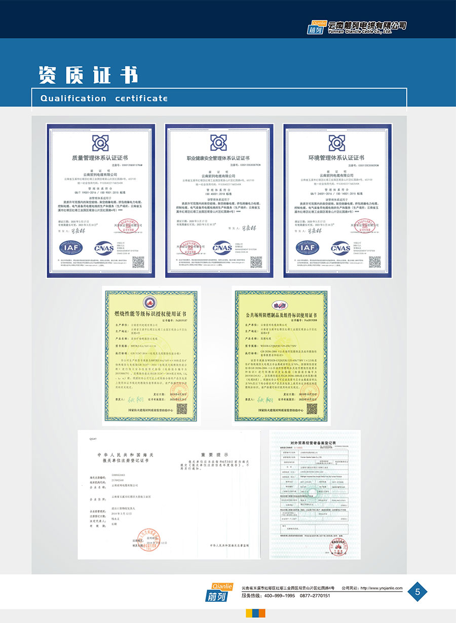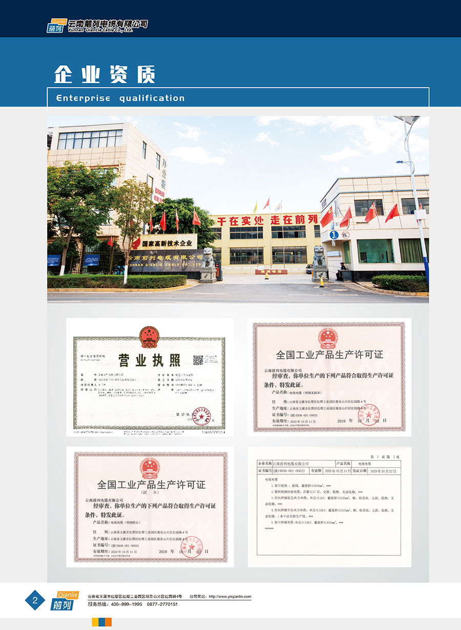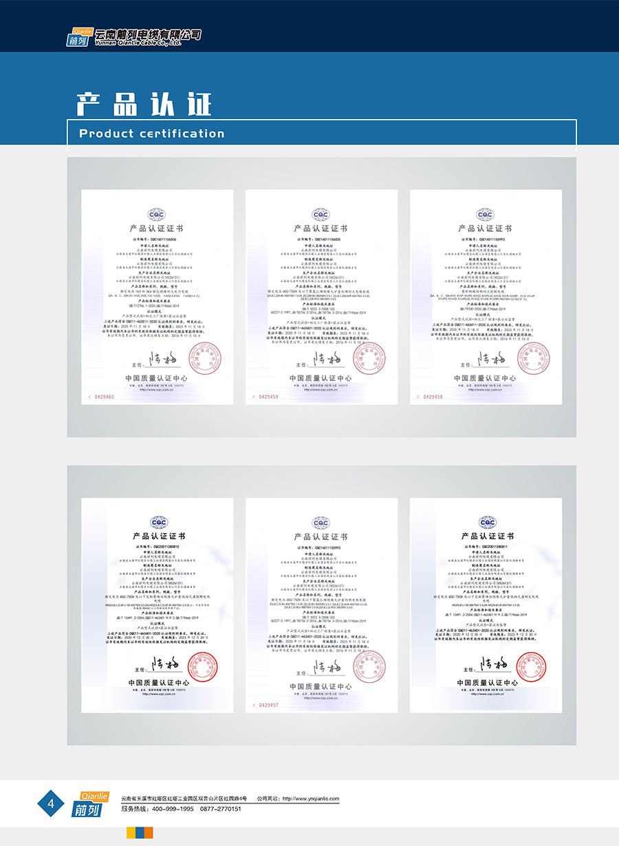 企業管理先進,設施完善,全部產品取得全國工業產品生產許可證證書,電線取得了中國強制性產品CCC認證,同時取得了中國質量認證中心CQC產品自愿認證、RoSH產品認證。前列電纜通過了質量管理體系認證、環境管理體系認證、職業健康安全管理體系認證、能源管理體系認證、兩化融合管理體系認證、五星級售后服務管理體系認證,產品抽檢合格率達100%。公司于2007年成立了企業技術中心,并于2010年被認定為市級企業技術中心,同年被認定為高新技術企業,2014年被認定為云南省創新型試點企業,2015年被認定為玉溪市電線電纜工程技術研究中心,2020年被認定為云南省企業技術中心,2020年前列電纜“基于工業互聯網的電線電纜智能制造新模式應用項目”被列為云南省工業互聯網試點示范項目,2021年被認定為云南省專精特新小巨人企業,2021年云南省工業互聯網“三化”改造試點示范項目,2022年被認定為云南省綠色工廠、云南省工業產品質量標桿企業、云南省知識產權優勢企業。“前列”牌電線電纜是云南名牌、云南省著名商標、玉溪市民營企業公益之星,多次獲得新產品、新技術金獎、消費者信得過產品、質量服務3A企業等榮譽稱號。公司在2022年中國創新方法大賽全國總決賽當中取得云南賽區一等獎,全國一等獎。