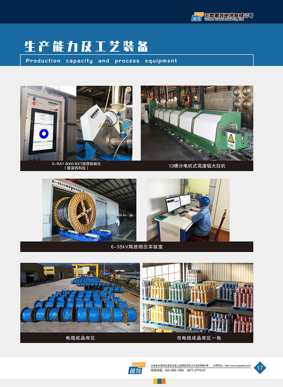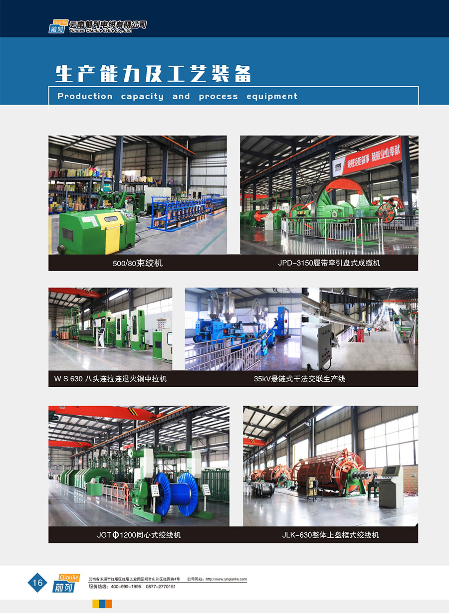 企業裝備有從國內外引進的制造及檢測設備,能按國家標準(GB)、國際電工委員會標準(IEC)及其它工業國家先進標準生產各種類型的優質電線電纜產品。