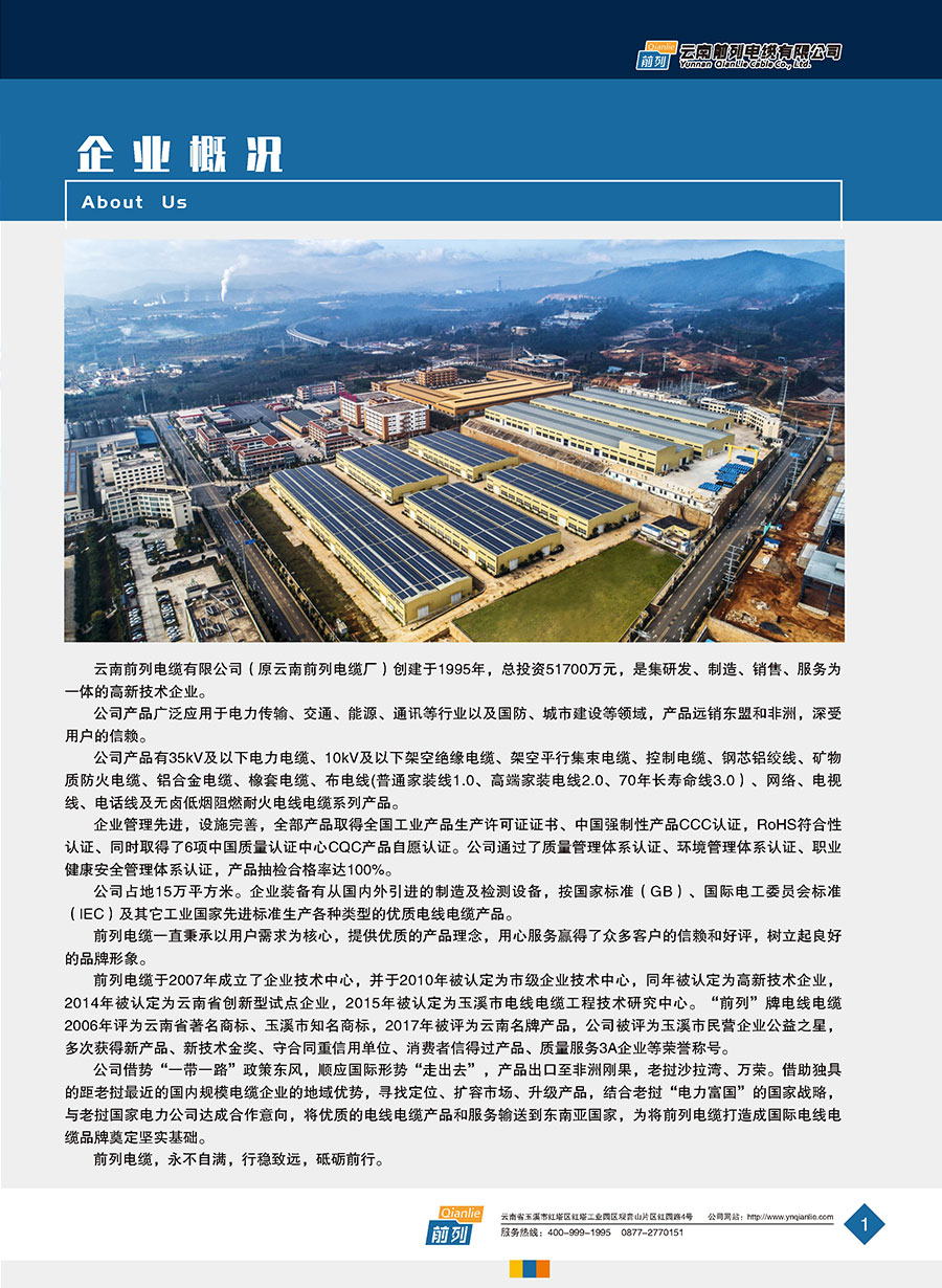 云南前列電纜有限公司(原云南前列電纜廠)創建于1995年,注冊資金21000萬元,是集研發、制造、銷售、服務為一體的高新技術企業。公司產品廣泛應用于電力傳輸、交通、能源、通信等行業以及國防、城市建設等領域,產品遠銷東盟和非洲,深受用戶的信賴。