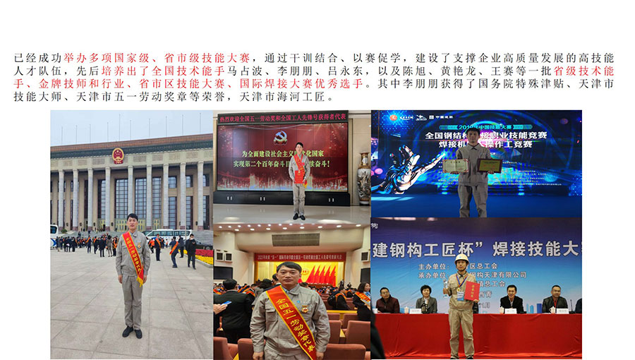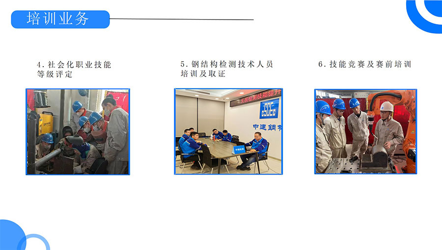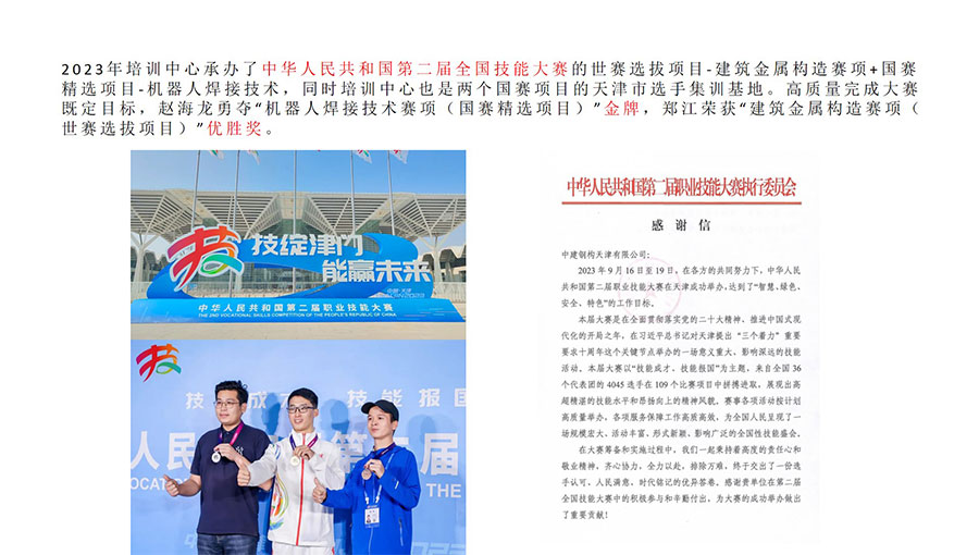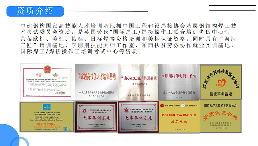 中建鋼構國家高技能人才培訓基地擁有中國工程建設焊接協會基層鋼結構焊工技術考試委員會資質,是英國勞氏“國際焊工/焊接操作工聯合培訓考試中心”,具備歐標、美標、俄標、日標焊接資格培訓和美標認證資格。同時具有“海河工匠”培訓基地、李朋朋技能大師工作室、東西扶貧勞務協作就業實訓基地、國際焊工/焊接操作工培訓考試中心等資質。