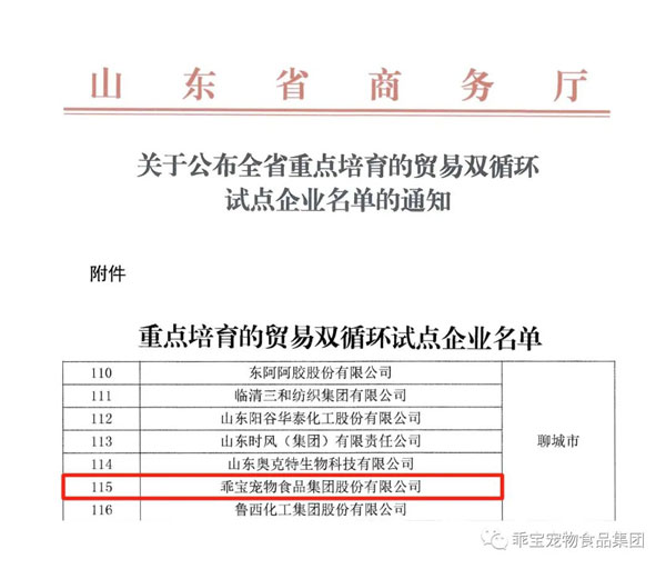 乖寶入選山東省重點培育的貿易雙循環試點企業