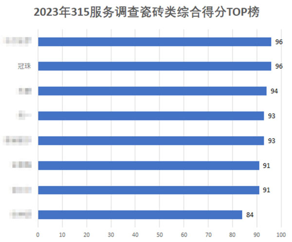 在2023年的315家居服務摸底中,共計調查了22家瓷磚品牌,綜合平均分達80.55分。其中,冠珠瓷磚以96分的成績高居第一位,再度蟬聯“年度家居行業服務榜樣”獎項。