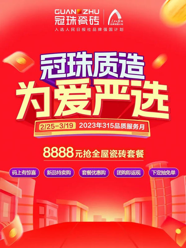 一直以來,冠珠始終堅持“嚴”字當頭,講中國故事,打造新國貨品牌形象。被認可的背后是優質的服務與口碑的沉淀。3月9-15日,冠珠瓷磚315品質服務月再出發,為愛嚴選,為品質發聲。用更好的產品、更好的服務、更好的體驗,筑就國人更美好的家。