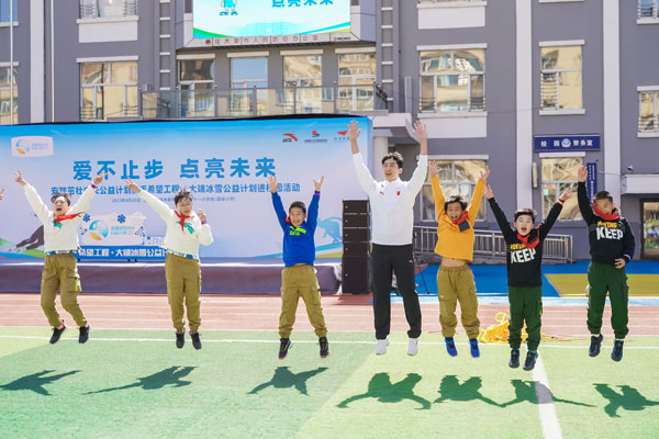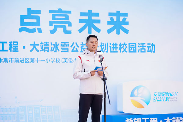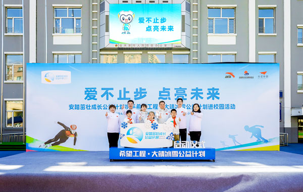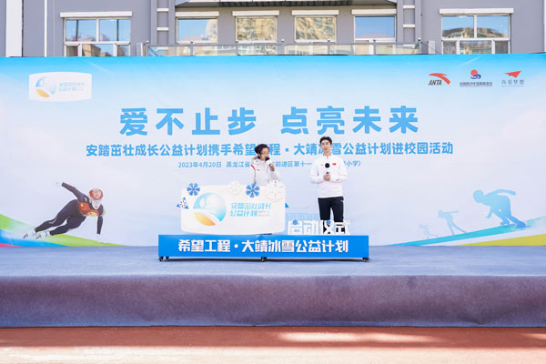 2023年4月20日,安踏茁壯成長公益計劃攜手希望工程·大靖冰雪公益計劃進校園啟動儀式,在黑龍江省佳木斯市前進區第十一小學(下簡稱十一小學)舉行。通過體教融合,深耕青少年體育公益,發展冰雪運動,為青少年茁壯成長賦能。安踏集團為十一小學全體師生捐贈了安踏裝備包,捐建了武大靖-安踏夢想中心,體育教師接受了安踏體育課教師培訓。短道速滑奧運冠軍武大靖重返兒時母校,分享冠軍故事,首次推出大靖冰雪課。安踏集團執行董事、聯席CEO吳永華,安踏集團副總裁李玲,共青團黑龍江省委書記徐長勇,黑龍江省佳木斯市委副書記、代市長王鐵,上海真愛夢想公益基金會理事長潘江雪,共同出席活動,央視頻進行了全程直播。