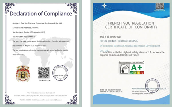 皇氏工匠美縫產品擁有非常全的環保檢測項目,不僅通過國內數項權威環保檢測,還獲得了多項國際環保認證,包括法國A+認證、比利時皇家認證、德國AgBB等。