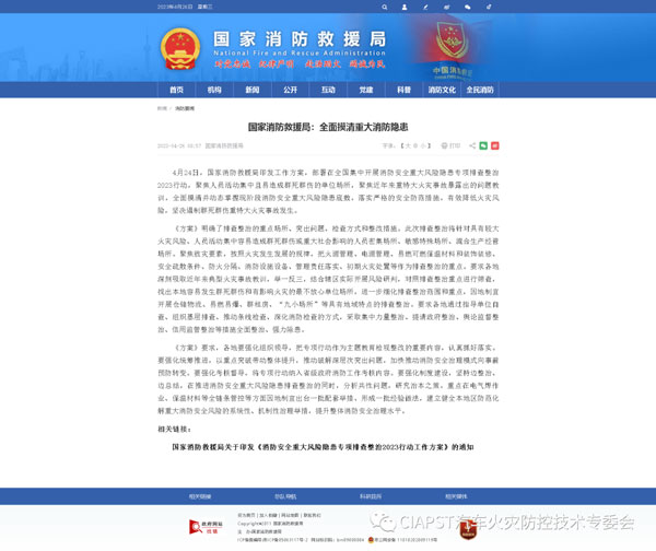 4月24日,國家消防救援局印發工作方案,部署在全國集中開展消防安全重大風險隱患專項排查整治2023行動,聚焦人員活動集中且易造成群死群傷的單位場所,聚焦近年來重特大火災事故暴露出的問題教訓,全面摸清并動態掌握現階段消防安全重大風險隱患底數,落實嚴格的安全防范措施,有效降低火災風險,堅決遏制群死群傷重特大火災事故發生。