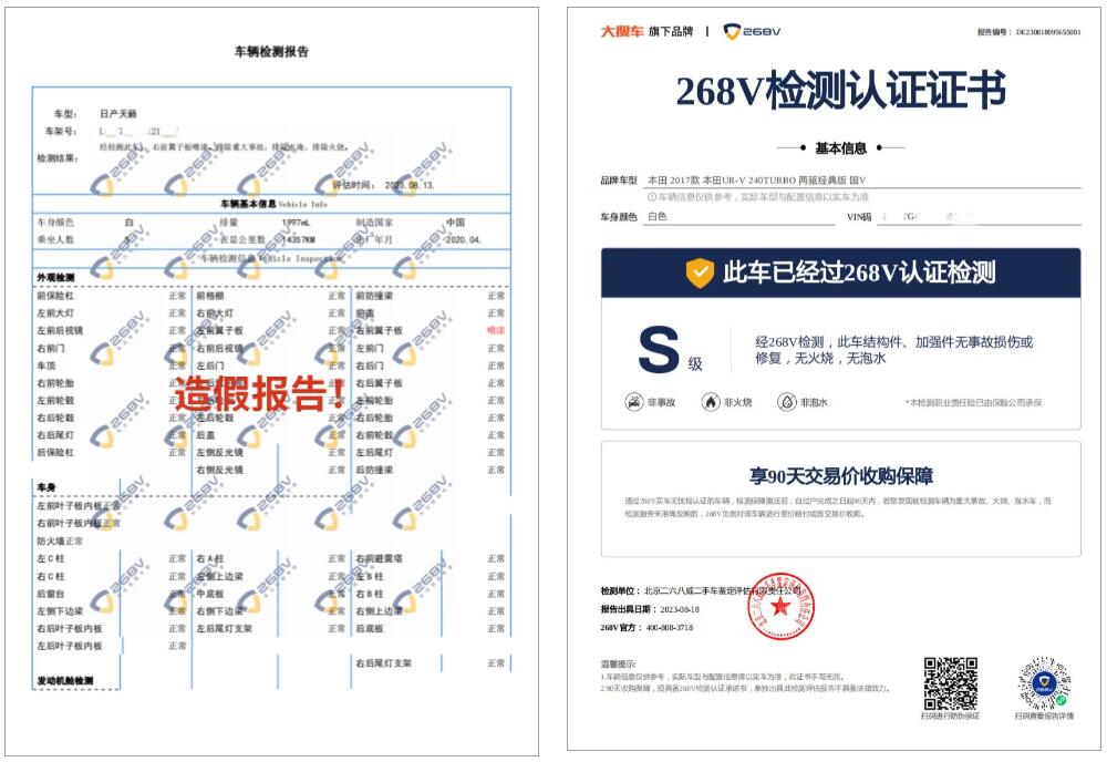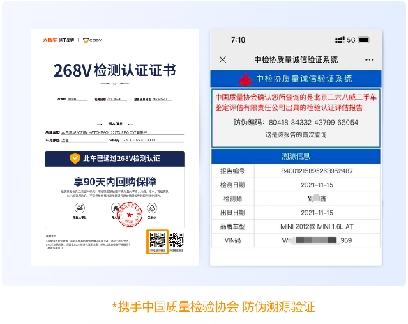 首先,268V官方提供的檢測報告,是支持“防偽溯源查詢”,每份報告均可驗證真偽。消費者在買車時,如果檢測報告是268V的,直接掃描防偽查詢二維碼,對報告進行驗證,假報告第一時間不攻自破;