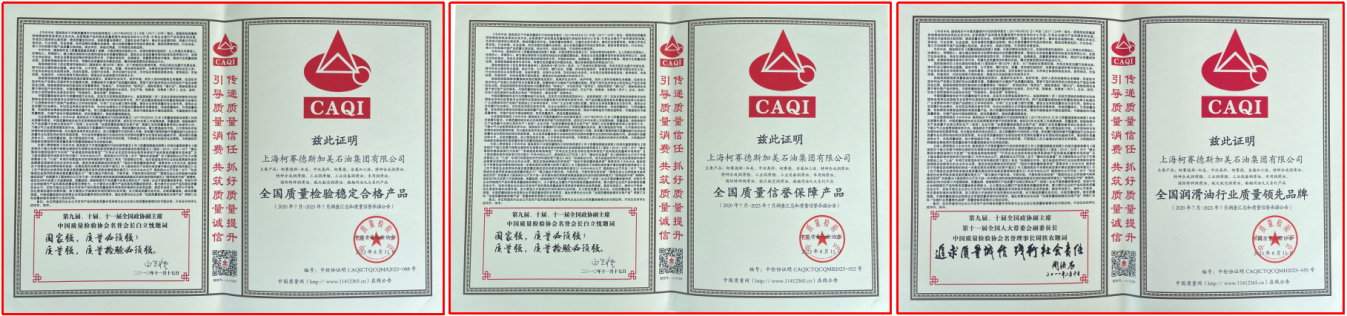 迎接即將到來的又一個全國質量月——9月之際,8月11日,中國質量協會向上海柯賽德斯加美石油集團有限公司頒發三大榮譽,即全國質量檢驗穩定合格產品、全國質量信譽保障產品、全國潤滑油行業質量領先品牌。這是在新的市場形勢下,柯賽德斯加美石油集團深耕能源,堅持質量振興企業、科技助推發展、誠信塑造品牌戰略的長期努力結出的碩果。